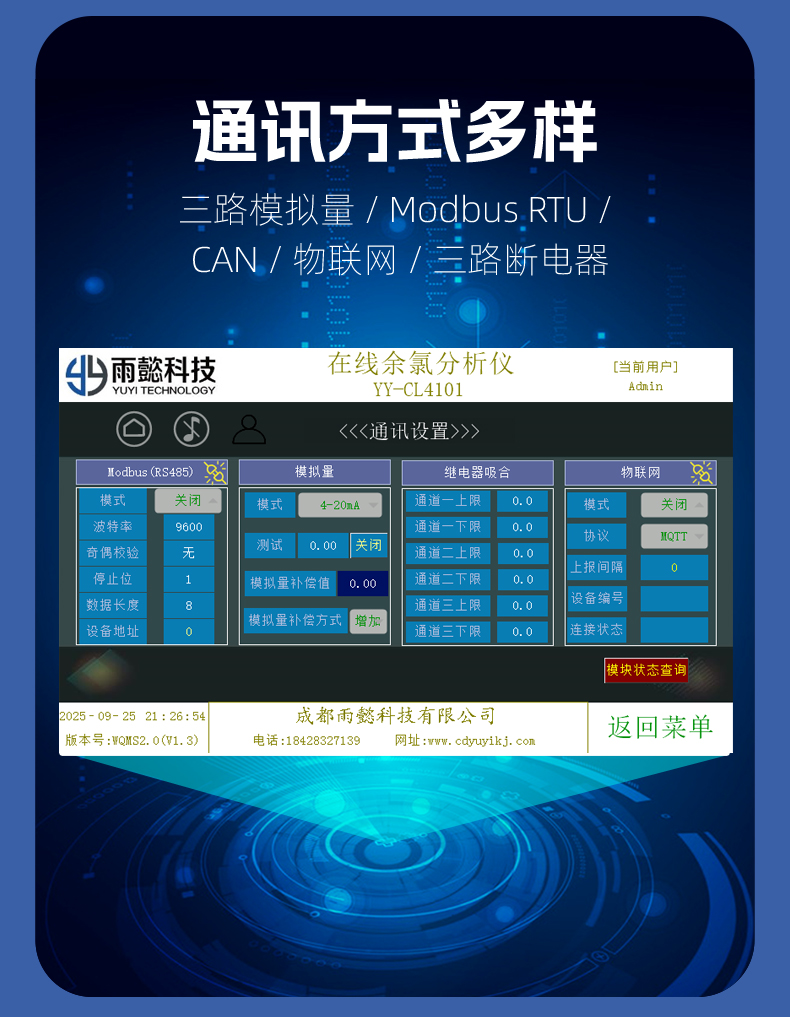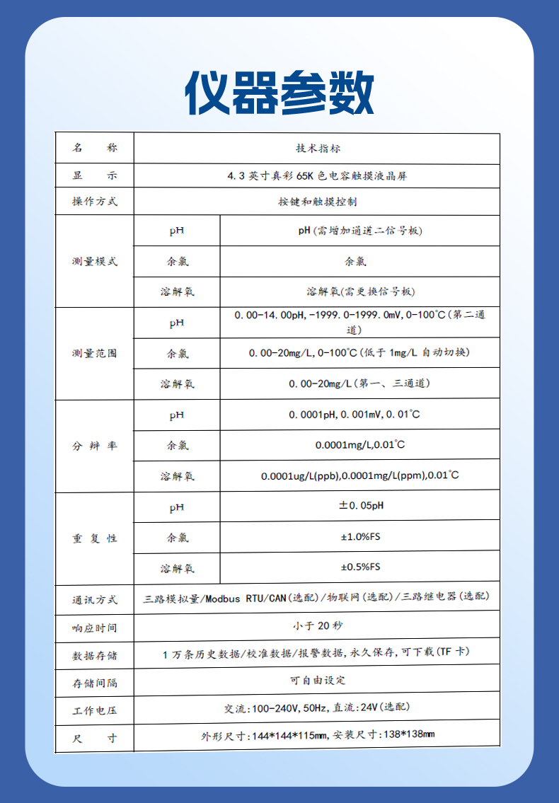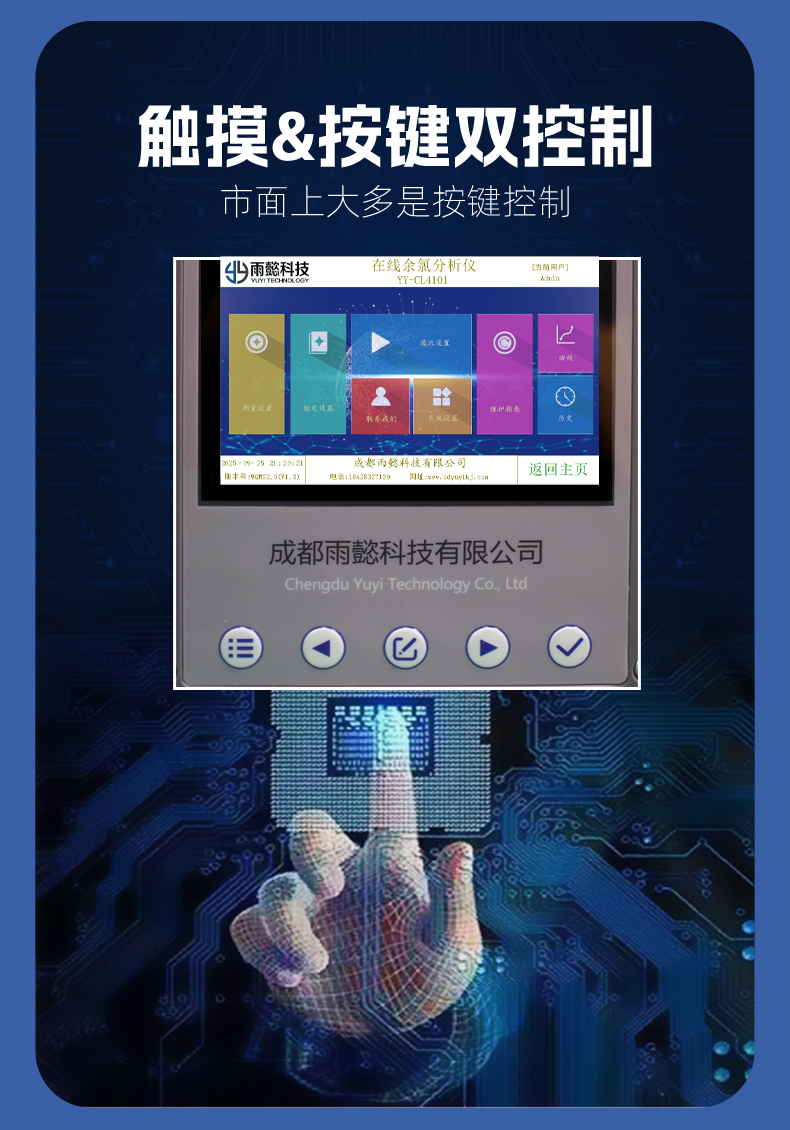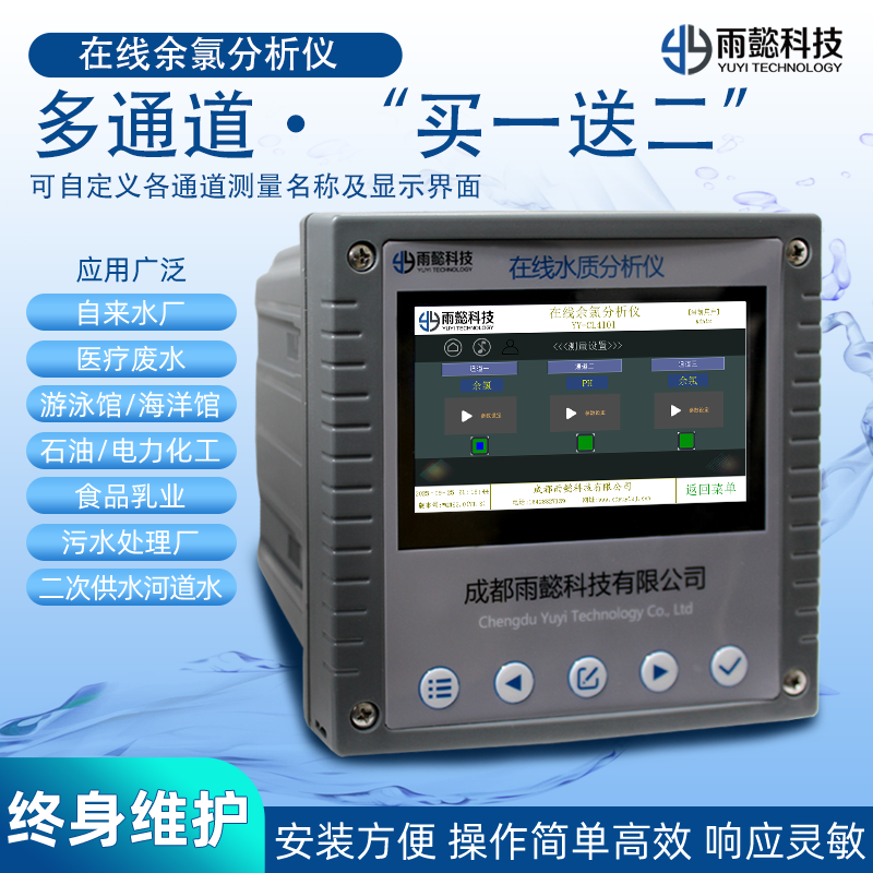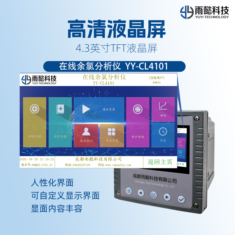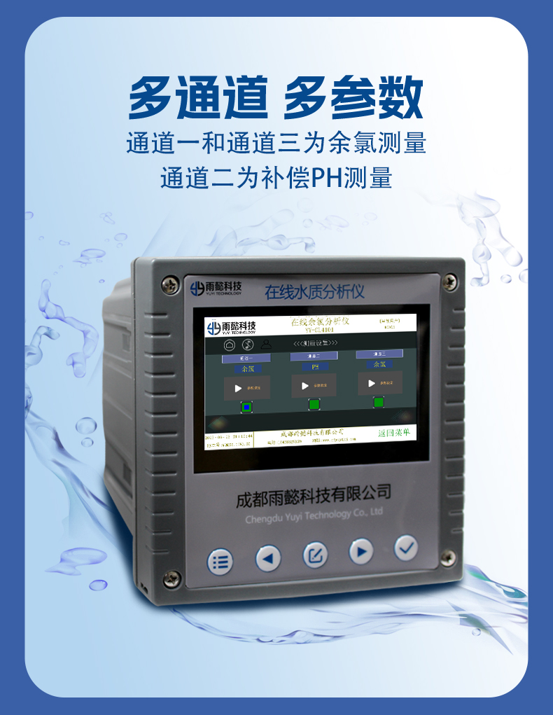 YY-CL4101在线余氯分析仪是我公司自主研发生产的一款通用型在线仪表测量二次仪表,最多可同时显示三个通道的测量参数<通道一和三显示余氯测量信息,通道二为PH测量信息,用于余氯测量补偿>。4.3寸TFT电容液晶触摸屏显示界面,支持按键和触摸控制,让您的操作变的得心应手,人性化的显示界面,展现了多种测量信息,为您的工作提供多方面的参考信息,可自定义各通道测量名称,方便了解对应通道的测量信息。
